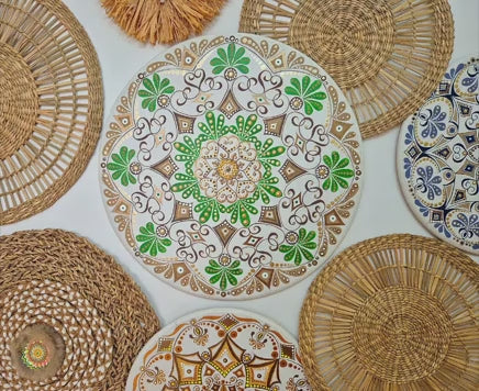 The mandala is painted with high-quality acrylics on an MDF base and finished with a protective acrylic varnish. A small hook on the back makes it easy to hang on the wall