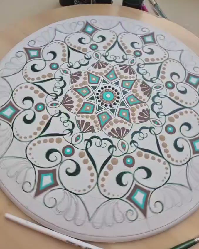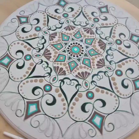 The mandala is painted with high-quality acrylics on an MDF base and finished with a protective acrylic varnish. A small hook on the back makes it easy to hang on the wall