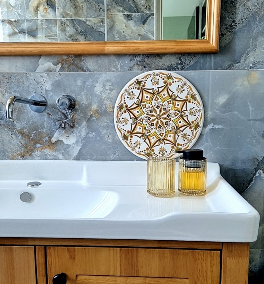 The mandala is painted with high-quality acrylics on an MDF base and finished with a protective acrylic varnish. A small hook on the back makes it easy to hang on the wall
