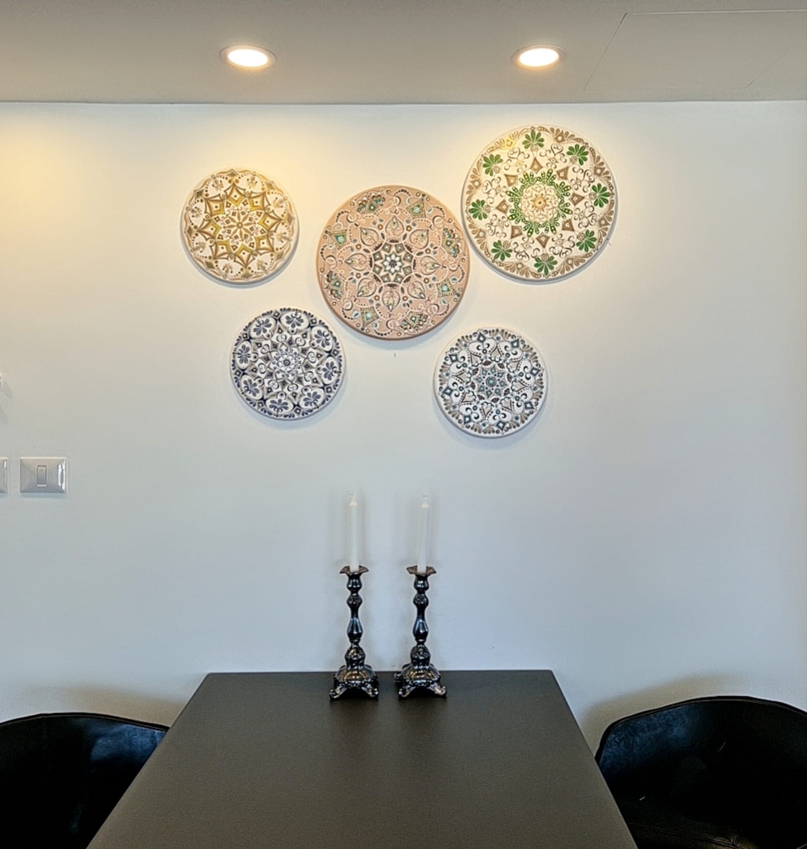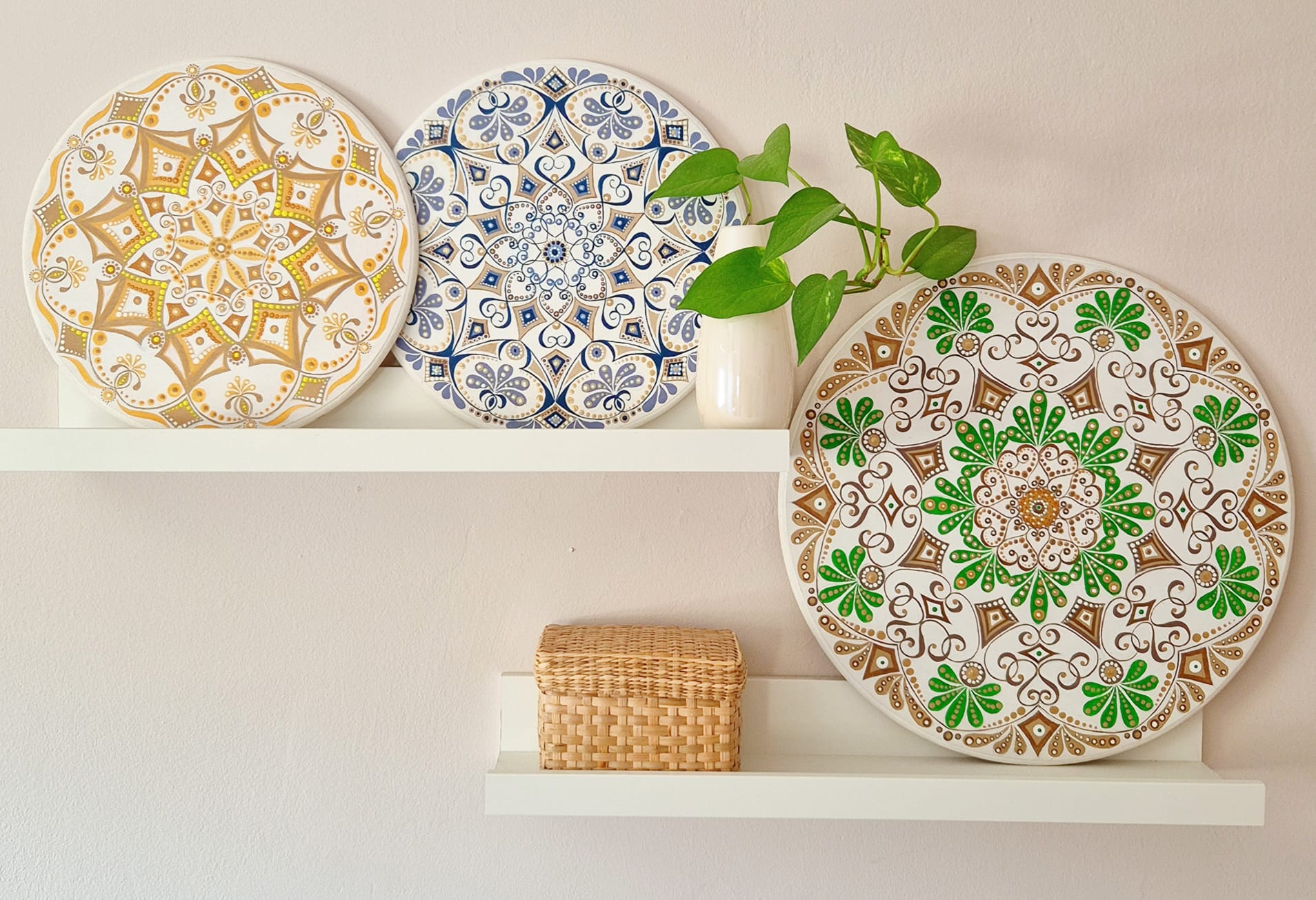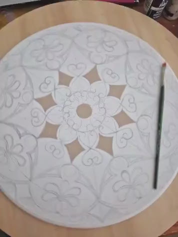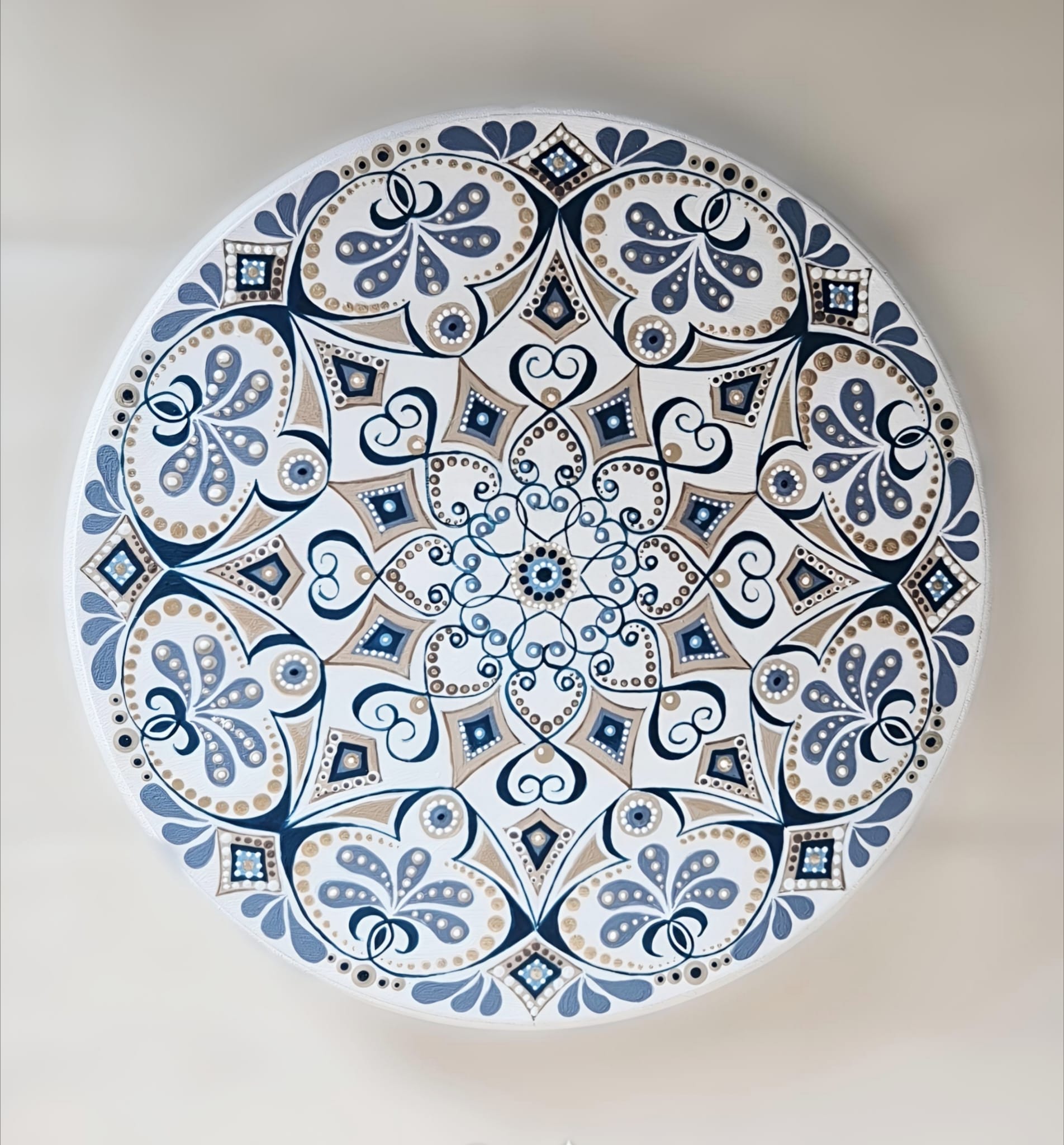 The mandala is painted with high-quality acrylics on an MDF base and finished with a protective acrylic varnish. A small hook on the back makes it easy to hang on the wall