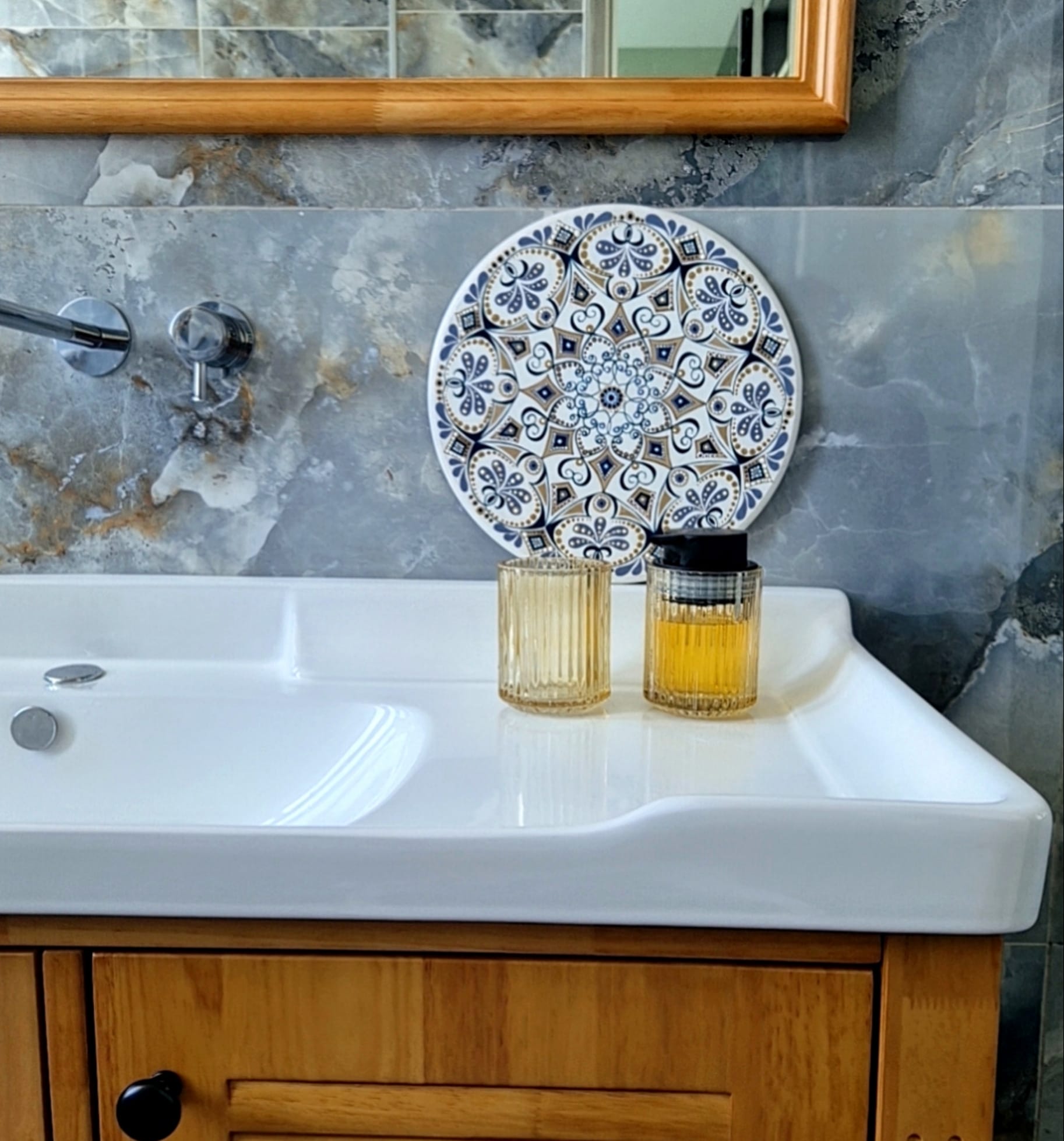 "Sea Pearl" is a mandala inspired by the Mediterranean Sea. It features oceanic shades of deep blue sea and shimmering sand. This piece brings a touch of ocean magic to any space, making it an ideal focal point or a unique gift.