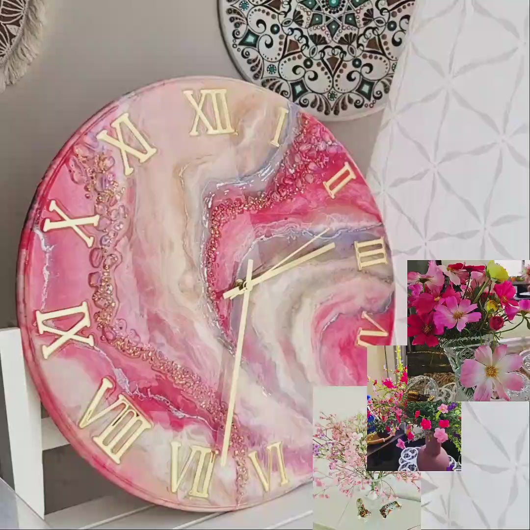 Handmade epoxy resin wall clock inspired by the natural beauty of agate stone. Soft pink and ivory swirls, golden Roman numerals, and shimmering details create a luxurious accent for your home décor. A perfect blend of elegance and functionality for any interior.